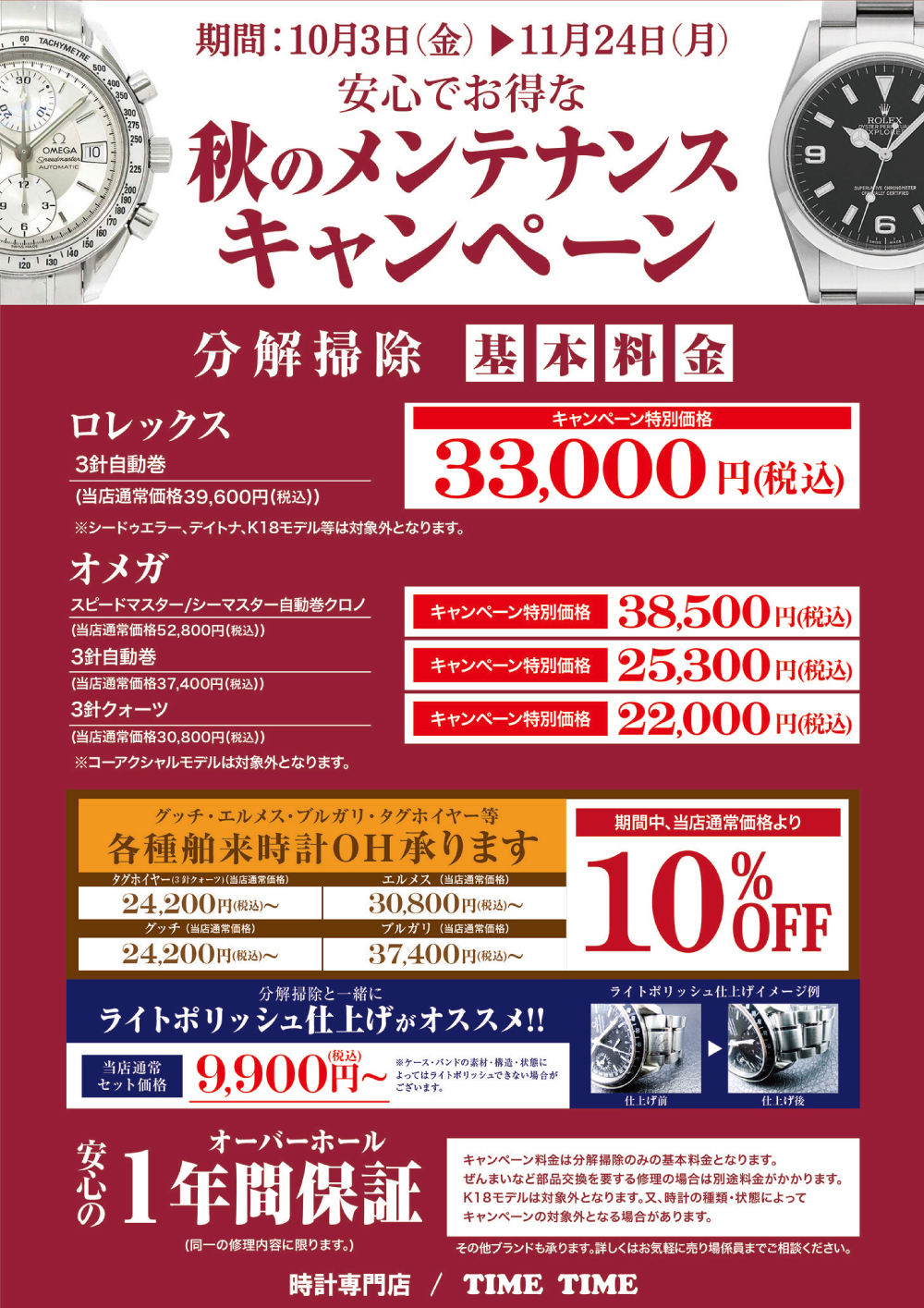 ただいま、時計専門店タイムタイムでは安心でお得なメンテナンスキャンペーン開催しています。